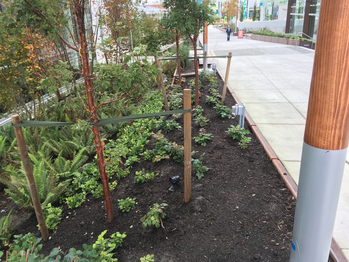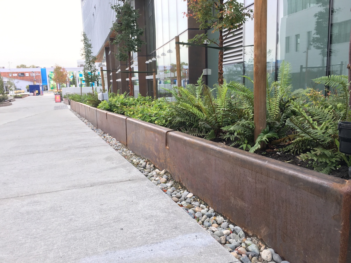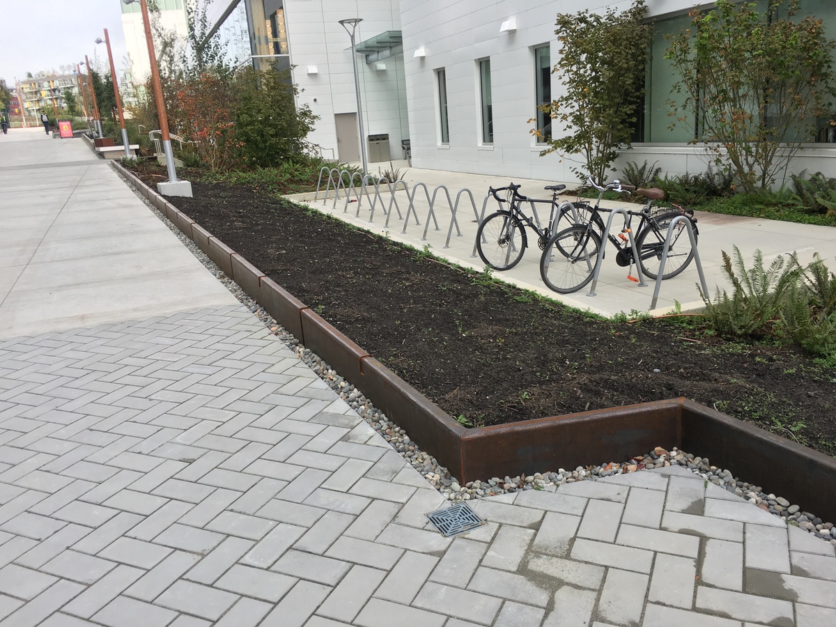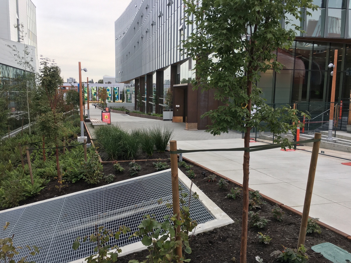 The pedestrian walkway between 565 Great Northern Way and Emily Carr University is landscaped with drought-resistant native vegetation which requires little irrigation. Planters are made out of steel rather than concrete, which allow for a higher volume of soil in a narrow space. The walkway is designed with a gradual slope utilizing gravity for water flow from the plaza through the planters. Water is filtered and used by the plants as it flows, so the volume of storm water entering the city sewage system is minimized, resulting in less runoff and contamination entering local waterways.