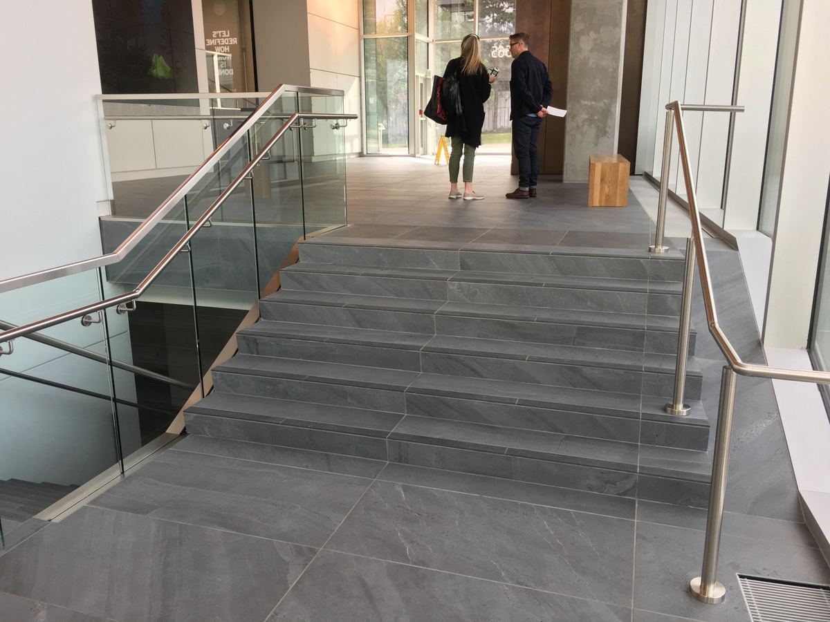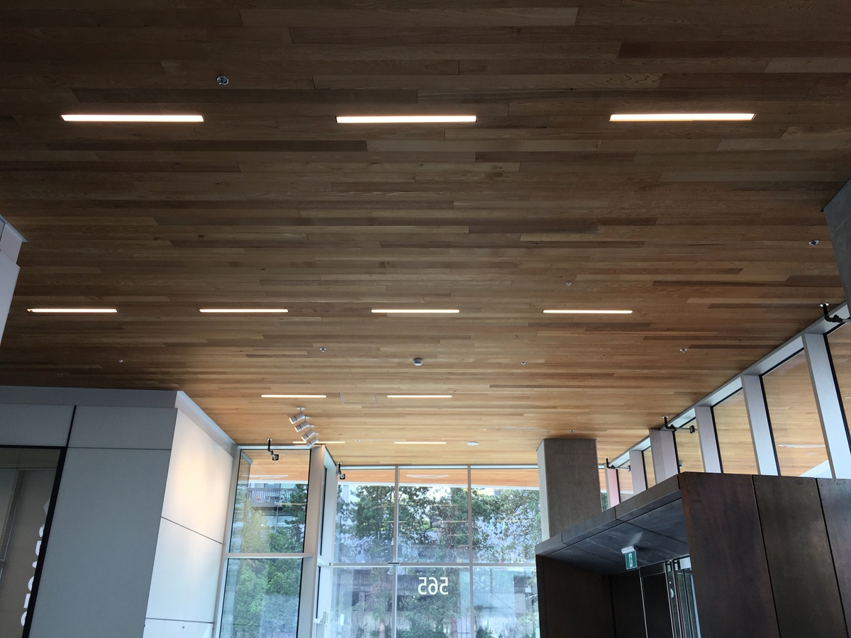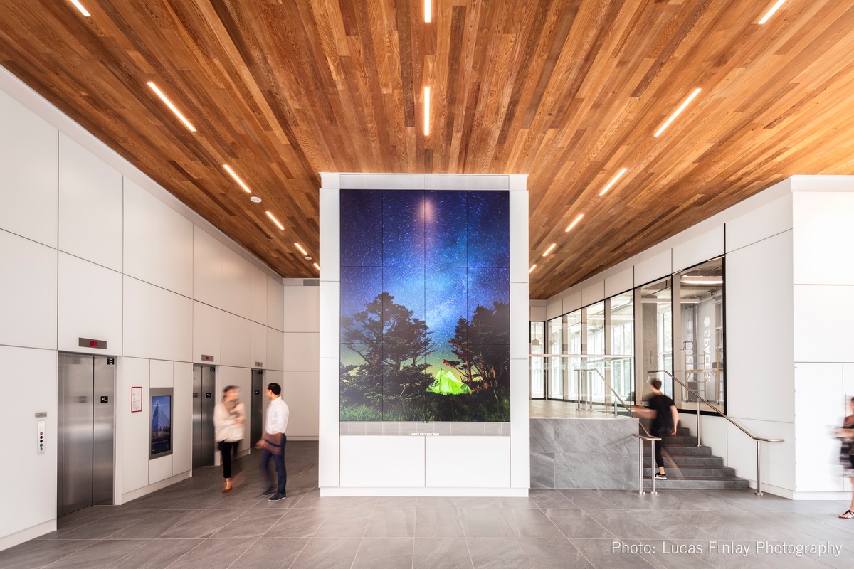 The pavilion also connects the exterior space of the plaza with the lobby of the offices at 565 Great Northern Way. The lobby was designed to feel like an art gallery with large white walls for display, and will feature a rotating selection of art works installed in collaboration with Emily Carr University.
