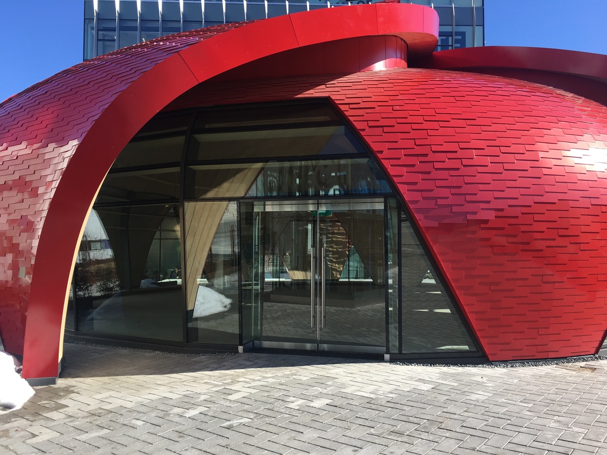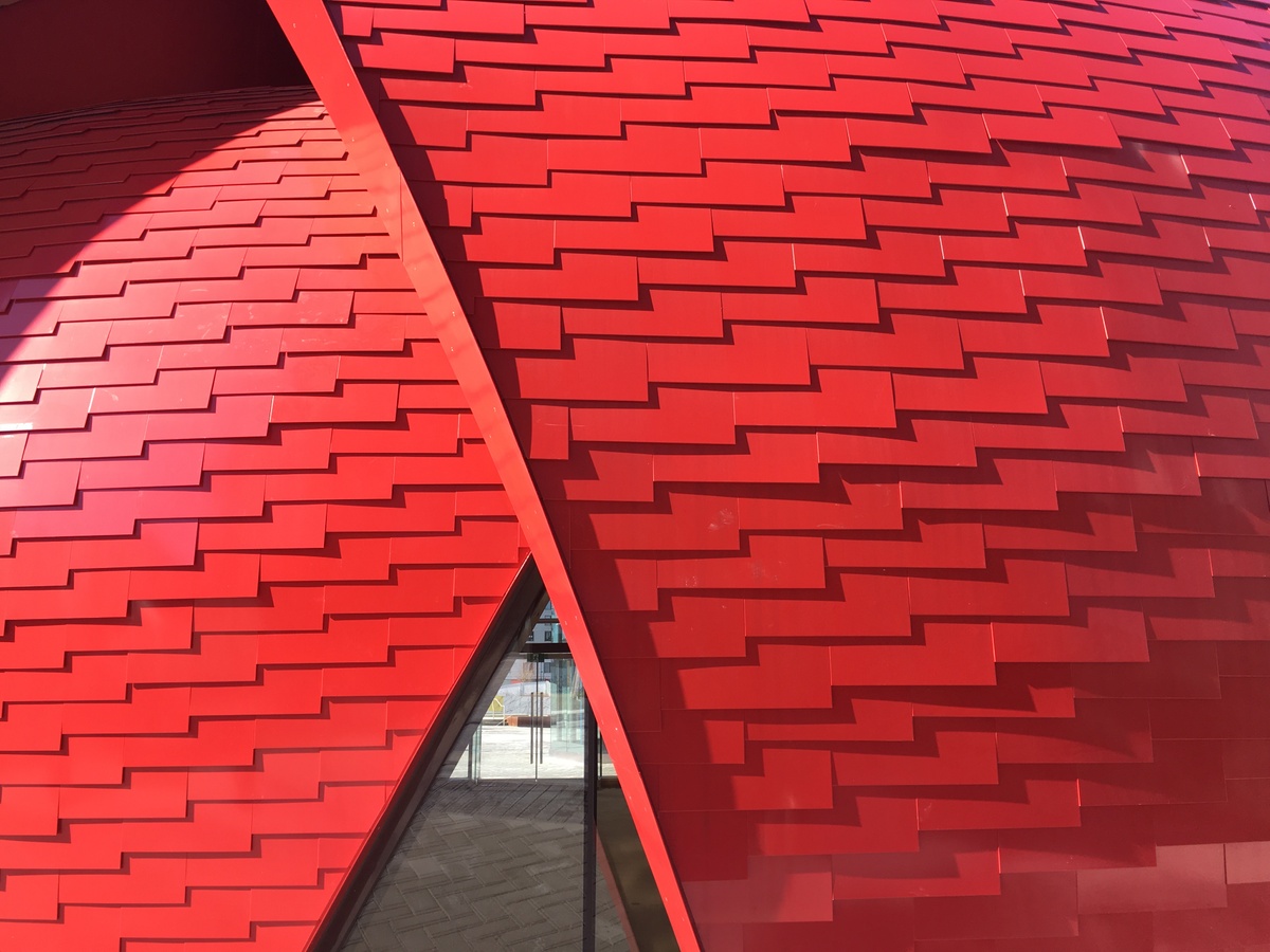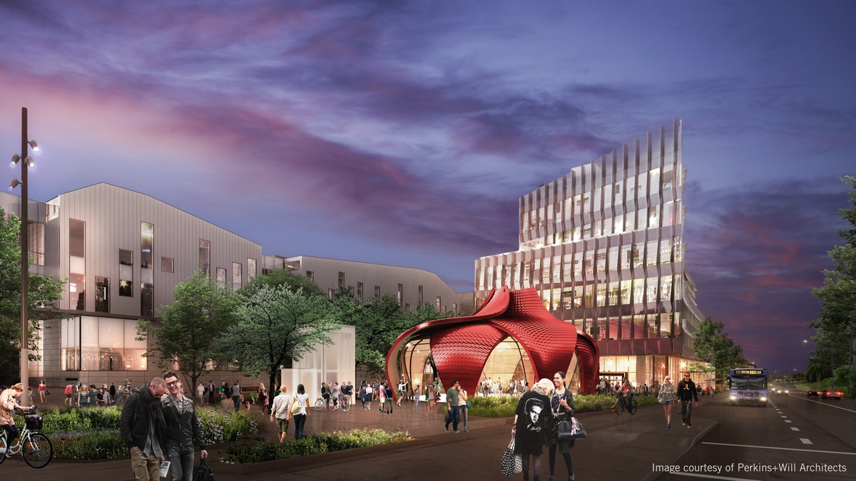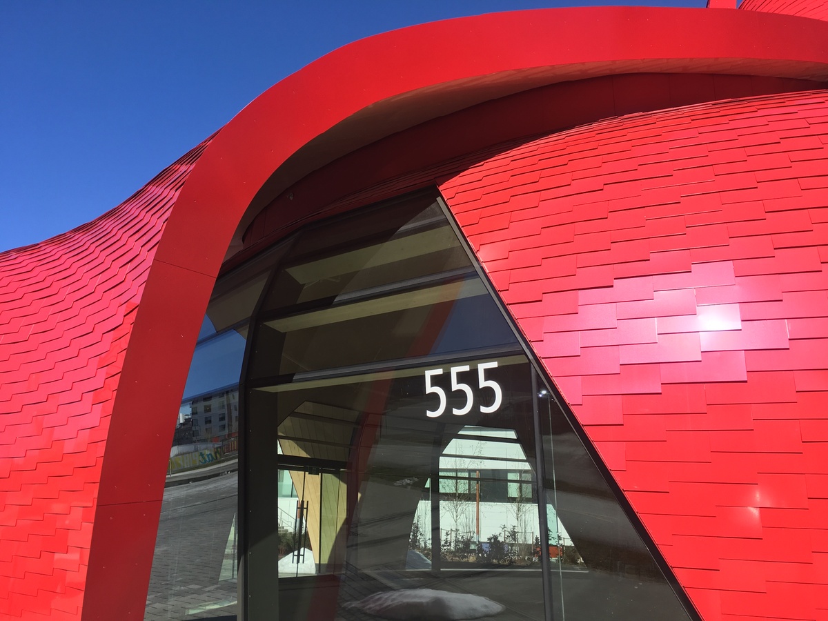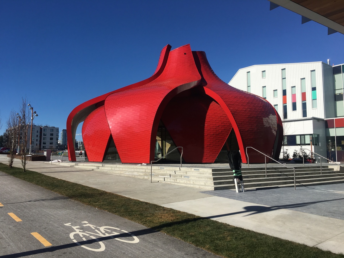 Within the plaza sits an eye-catching 2,000 sq. ft. public pavilion which houses a coffee shop. The pavilion was envisioned by Perkins + Will as both a social space for congregation and as a large public sculpture, connecting artistically to the surroundings. An abstract form, it is composed out of overlapping petals or leaves constructed of wood and covered in bright red shingles, referencing the form of a tulip or a pomegranate. The pavilion provides a space for the various communities of Great Northern Way to meet, and is a gateway at the heart of the development.