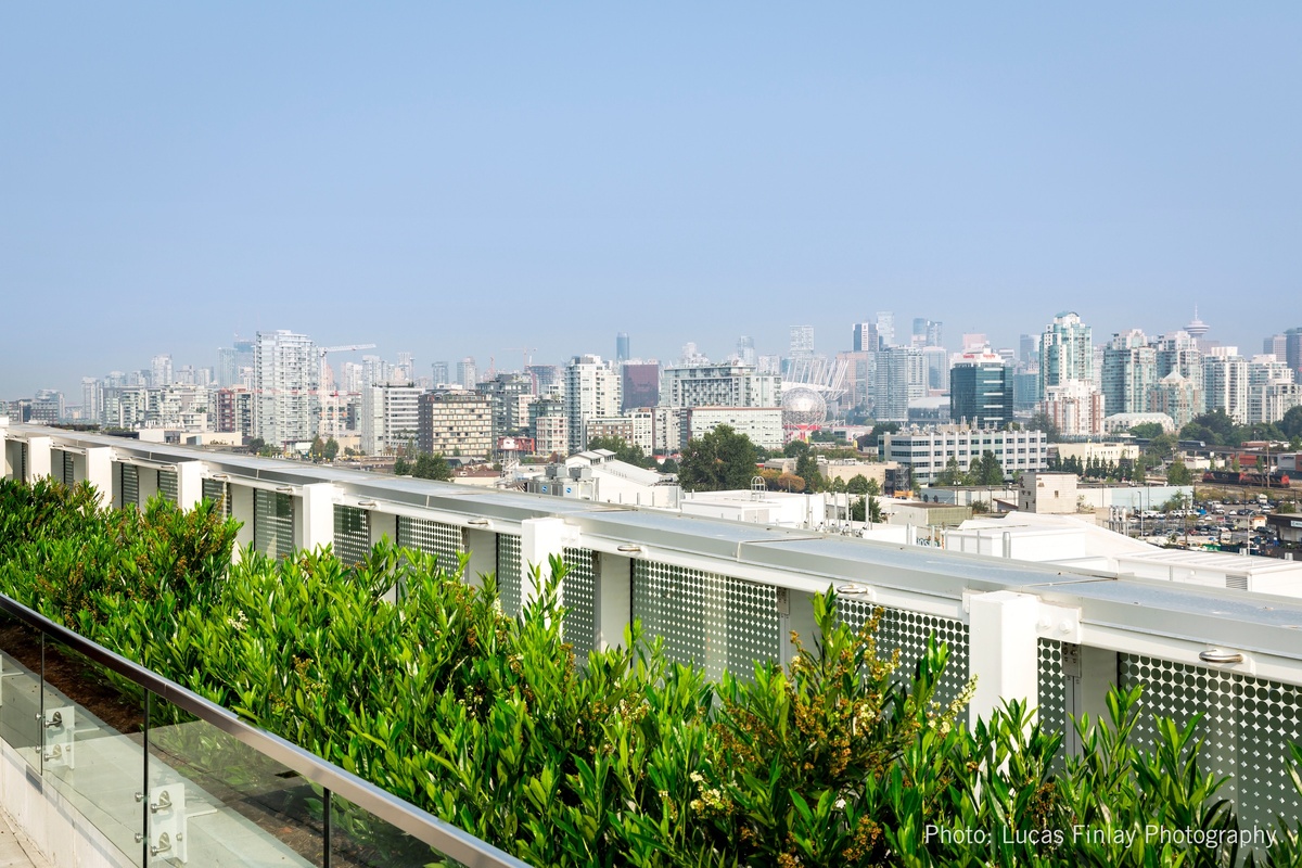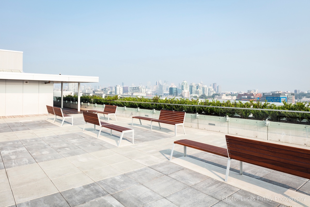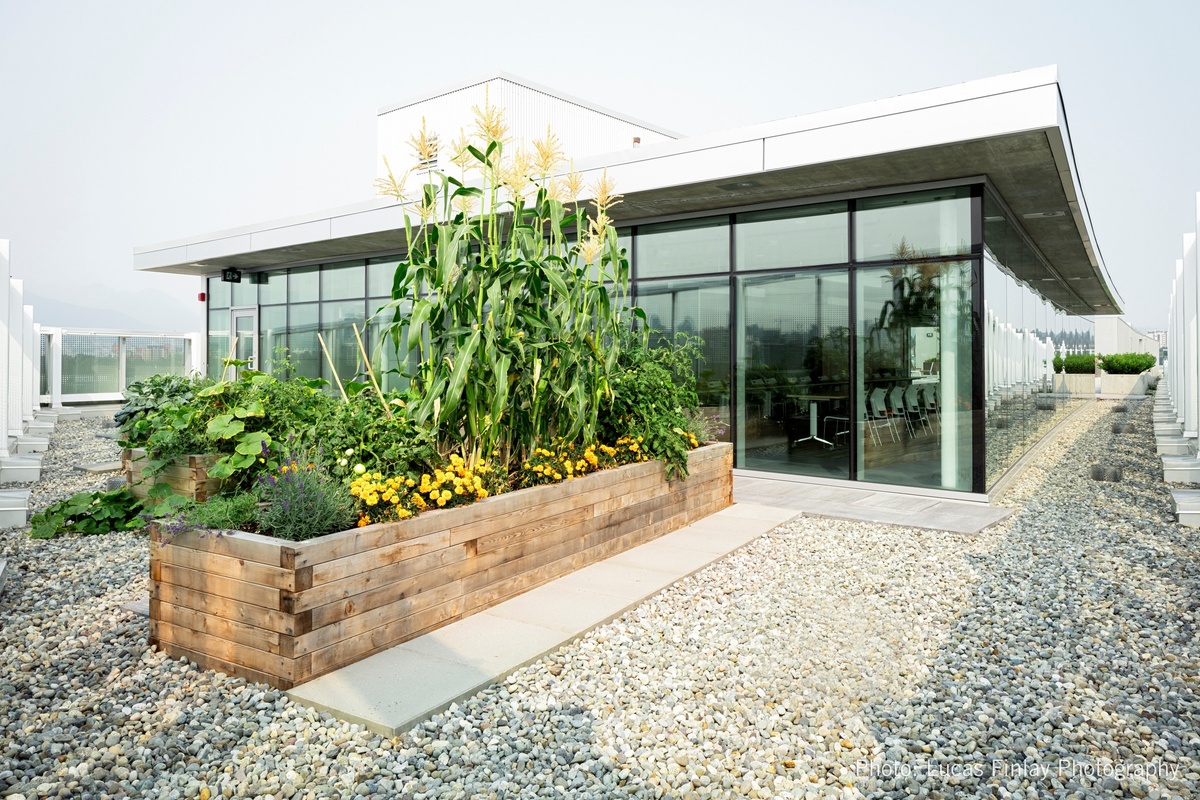 On the roof of the building, people can experience 360 degree views of the city and North Shore mountains. The roof features urban agriculture where tenants of the building can plant and maintain kitchen gardens for direct access to fresh food. The rooftop gardens and gathering place are an example of social sustainability and a benefit to tenants.
