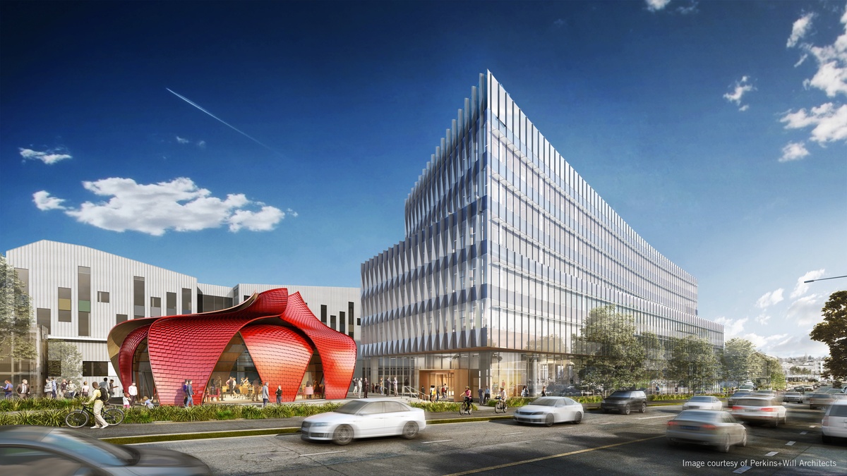 Original zoning for the office building designated a long footprint with a low height. Architects Perkins + Will shortened and heightened the design, providing opportunities for better views, more leasable space, and more public space with a large plaza.