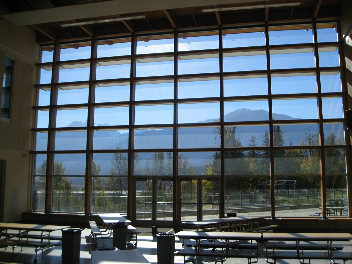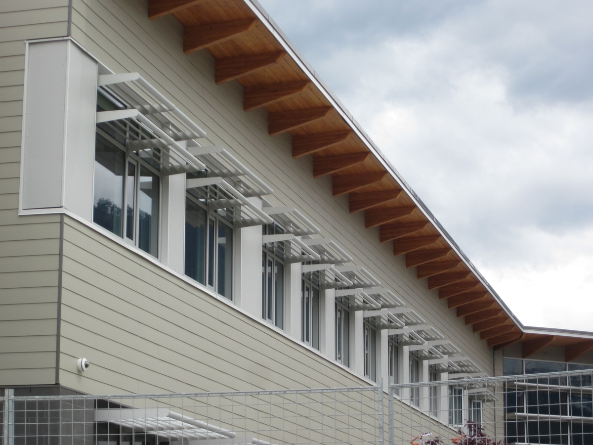 One of the most visible sustainability design features on the Revelstoke Schools project was the use of passive design. Passive solar design strategies emphasize building orientation to optimize the use of the sun’s light and heat, which reduces the need for mechanical lighting, heating and cooling. Solar shades on the windows and roof overhangs block the sun’s heat in the summer, while allowing light into the classrooms and offices. During the winter, when the sun is lower in the sky, the sun’s rays hit the windows and help to heat the space. Overall, this passive design is greatly assisted by a well-designed building envelope, which balances the proportion of windows and walls with high insulation values.