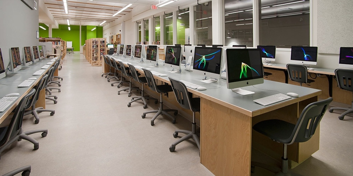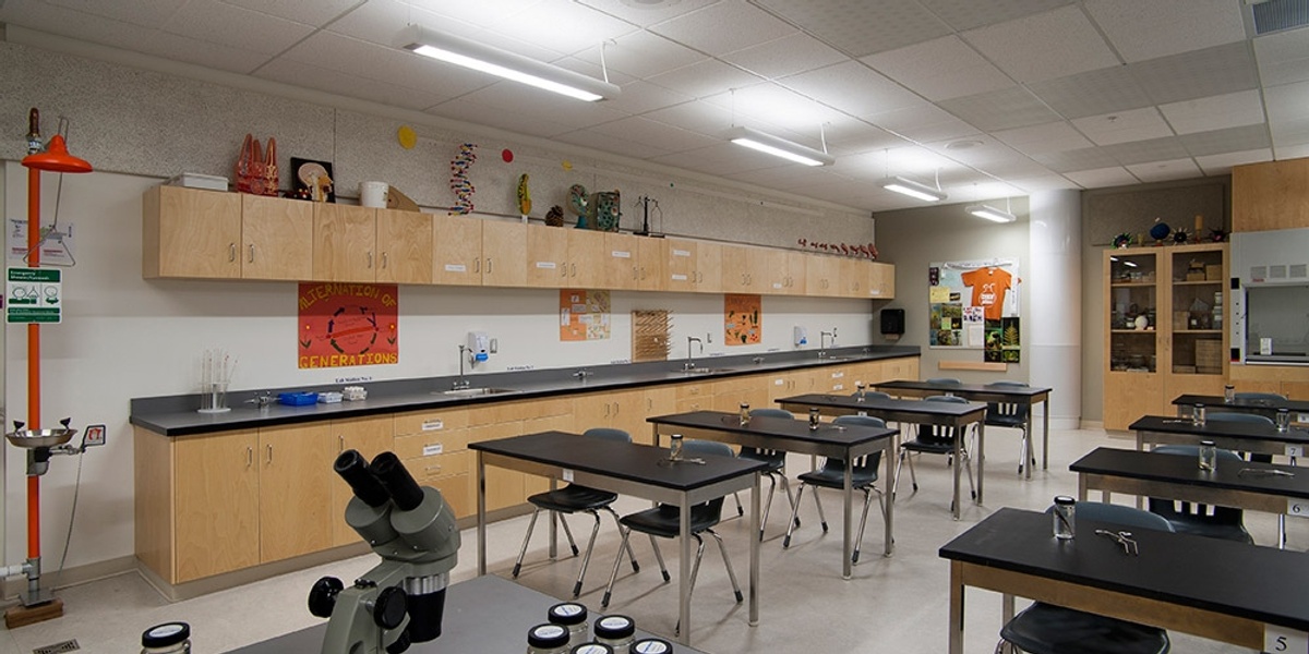 User data suggests a higher degree of satisfaction with direct/indirect fixtures in learning environments. To create this effect, daylight and electrical lighting systems combine for an efficient and smart system. Daylight is harvested using photocell devices to turn off one row of luminaires in instructional spaces. Photocells coupled with occupancy sensors with manual off overrides ensure classroom lighting is off while unoccupied. Classroom lighting contributes to the reduced energy consumption of the building. Calculated light levels in the classrooms during the day range from about 400 lux to over 1000 lux depending on the time of year, and orientation of the classroom.