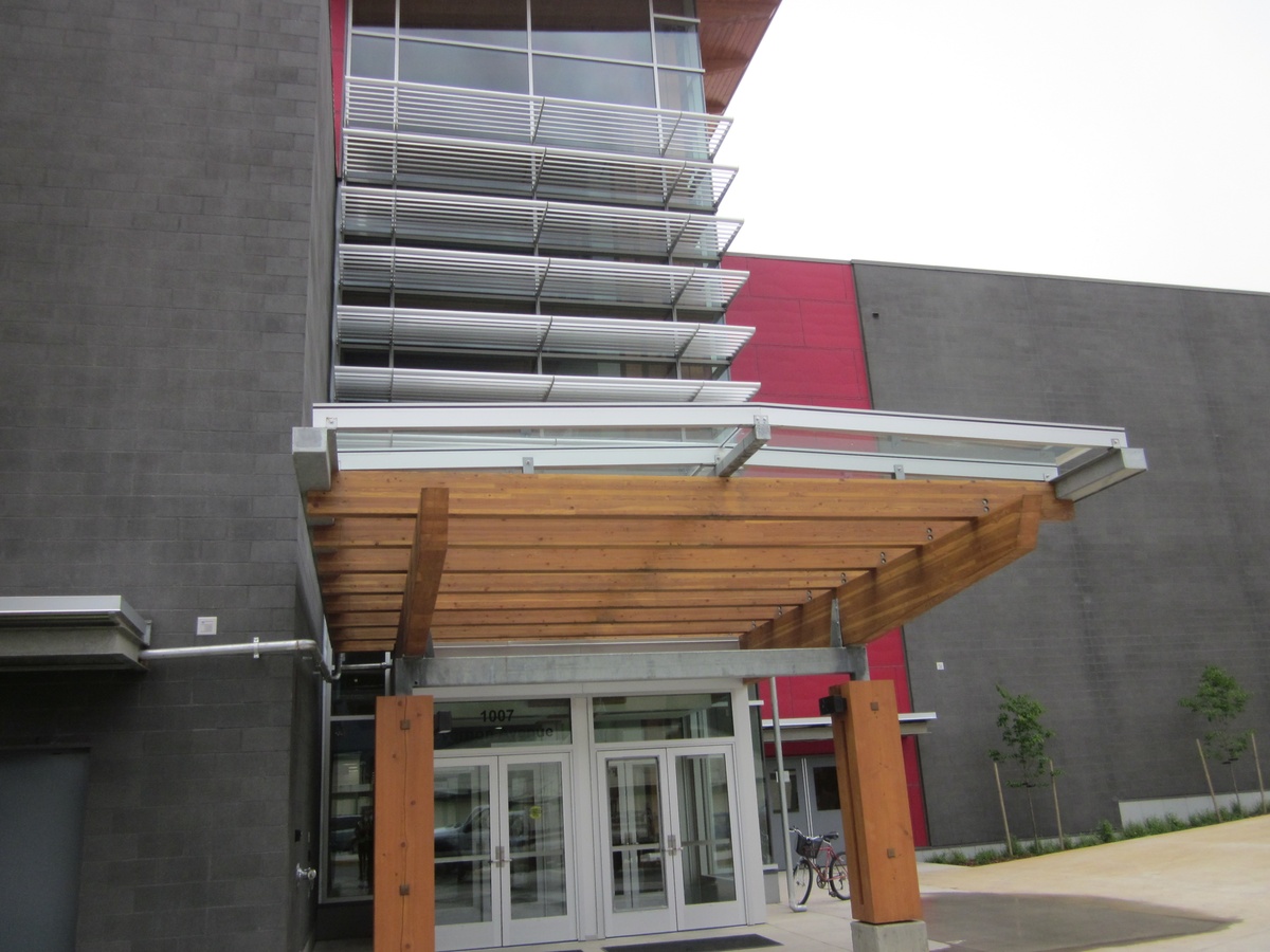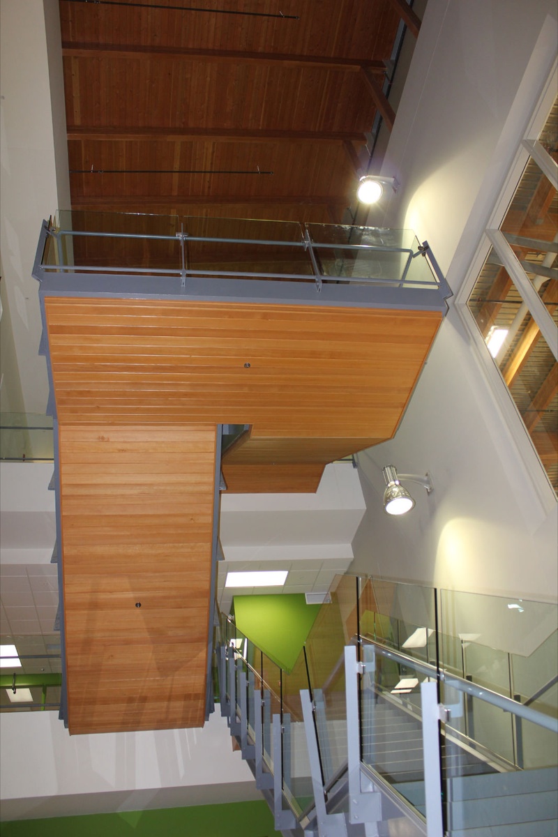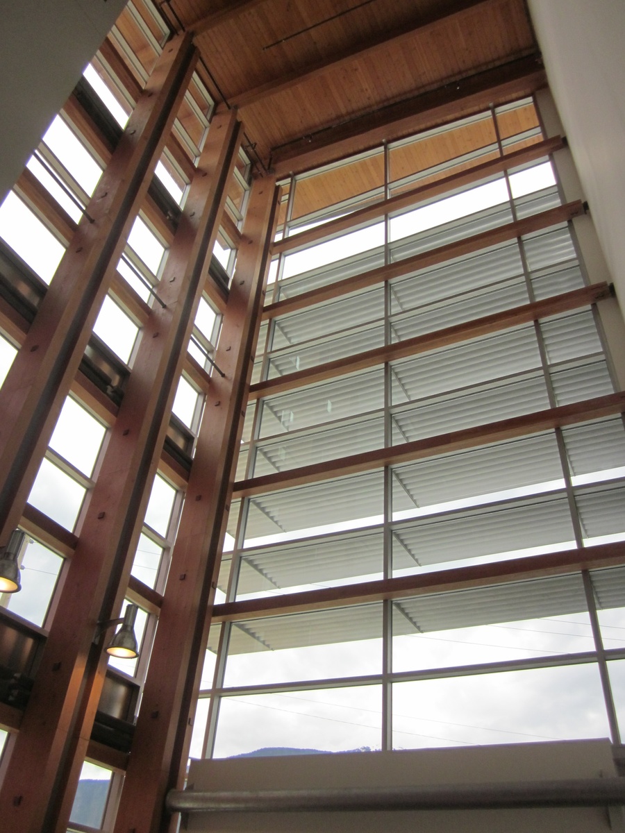 Local timber is highly visible throughout the buildings, with vaulting made from local cedar harvested in the Akolkolex Valley and locally milled in Revelstoke. Just like the wood chips used for the biomass for District Energy, the timber did not have to travel far to the site, in fact the mill is located just down the street, lowering the carbon footprint of the wood materials even further.