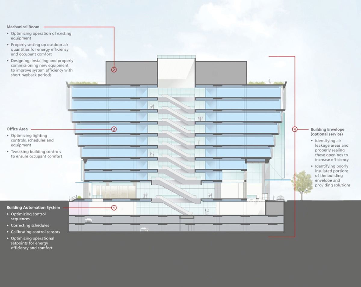 Eligible customers such as Oxford Properties received funding towards the cost of re-commissioning services to study their buildings and recommend energy efficiency improvements, as well as access to an energy management information system (EMIS) to assist in tracking their building’s performance after the re-commissioning work was complete. In return, program participants agree to implement, at their cost, measures identified by the re-commissioning study that have a payback of two years or less. MMM Group Ltd. conducted the retro-commissioning investigation as part of the program, in addition to supporting Oxford Properties through the process for LEED EBOM certification.